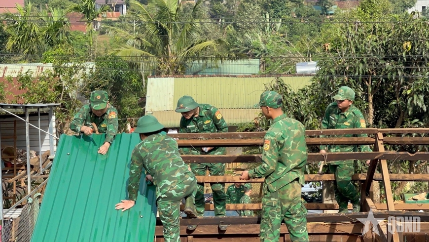 Cán bộ, chiến sĩ Đồn Biên phòng Cửa khẩu Thuận An giúp dân sửa chữa nhà sau bão lũ.