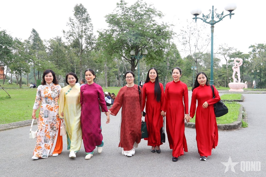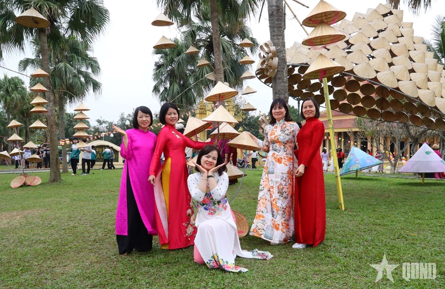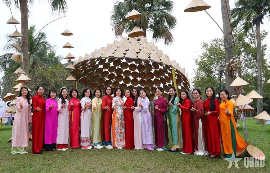 | Cán bộ, hội viên Hội Phụ nữ Văn phòng Bộ Quốc phòng tham quan Làng Văn hóa - Du lịch các dân tộc Việt Nam. |