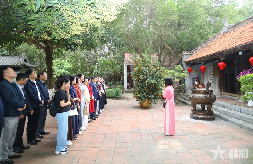 | Thiếu tướng Lê Văn Thuận và các đại biểu nghe giới thiệu về thân thế, sự nghiệp Hai Bà Trưng. |