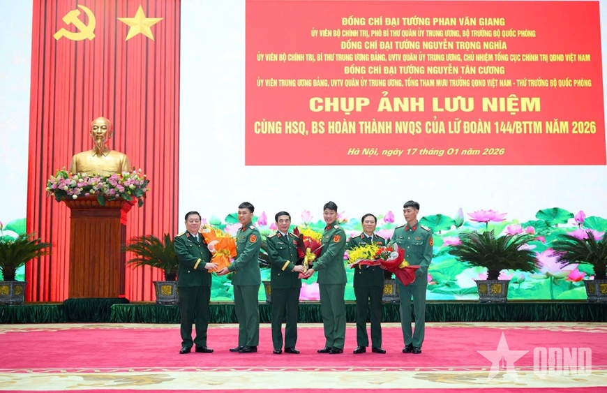 | Đại diện hạ sĩ quan, binh sĩ xuất ngũ năm 2026 của Lữ đoàn 144, Bộ Tổng Tham mưu tặng hoa lãnh đạo Bộ Quốc phòng. |