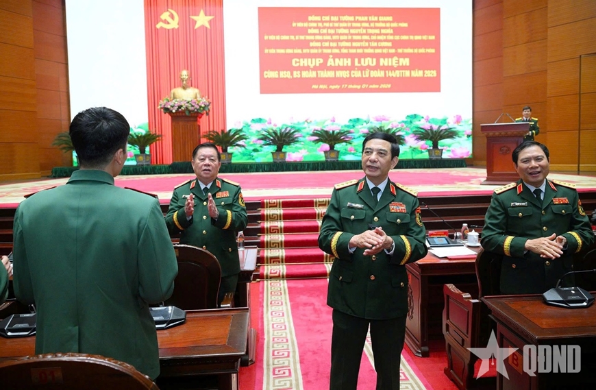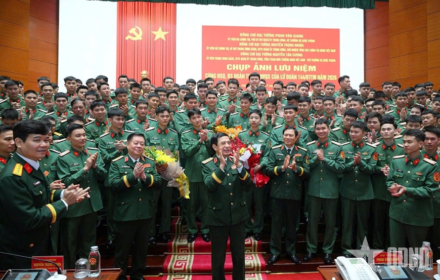 | Lãnh đạo Bộ Quốc phòng chụp ảnh cùng hạ sĩ quan, binh sĩ xuất ngũ năm 2026. |