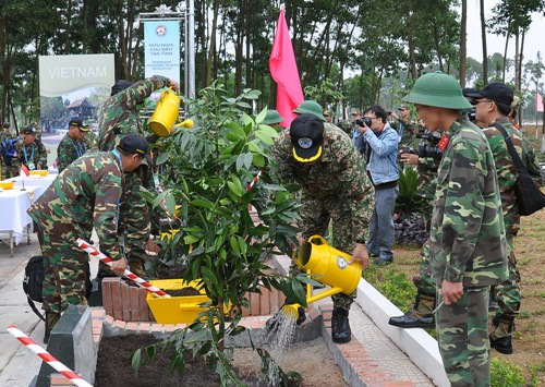 Lãnh đạo quân đội 10 nước tham gia hội thi trồng cây lưu niệm tại Trung tâm Huấn luyện Quốc gia Miếu Môn.