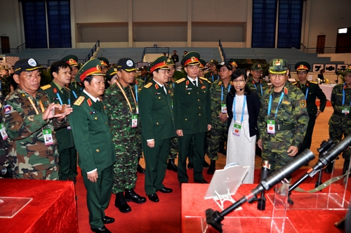 Các đồng chí Thượng tướng Ngô Xuân Lịch, Thượng tướng Đỗ Bá Tỵ, Thượng tướng Trương Quang Khánh, cùng đại biểu quân đội các nước tham quan triển lãm các thiết bị, mô hình quân sự do Quân đội nhân dân Việt Nam nghiên cứu chế tạo.
