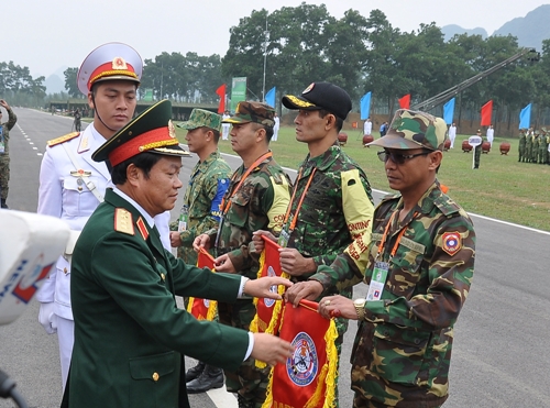 Thượng tướng Đỗ Bá Tỵ, Tổng Tham mưu trưởng Quân đội nhân dân Việt Nam trao cờ lưu niệm cho các trưởng đoàn xạ thủ của 10 nước tham gia hội thi.