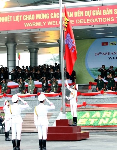Đúng 8 giờ 30 phút, nghi thức thượng cờ của Hiệp hội bắn súng quân dụng Quân đội các nước ASEAN chính thức được cử hành trang trọng trên nền nhạc trầm hùng của ca khúc “Khúc ca ASEAN” do cán bộ, chiến sĩ Đoàn Nghi lễ Quân đội (Bộ Tổng tham mưu) thực hiện.