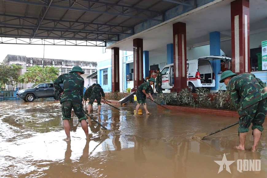 | Cán bộ, chiến sĩ Sư đoàn 315 (Quân khu 5) giúp các trạm y tế, bệnh viện trên địa bàn khắc phục hậu quả sau mưa, lũ.  |