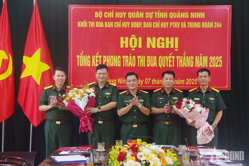 Đại tá Nguyễn Đình Khiêm, Ủy viên Ban Thường vụ Đảng ủy, Phó chính ủy Bộ CHQS tỉnh tặng hoa chúc mừng Trung đoàn 244 (đơn vị khối trưởng khối thi đua năm 2025) và Ban Chỉ huy phòng thủ khu vực 1-Quảng Hà (đơn vị tiếp nhận khối trưởng khối thi đua năm 2026). |