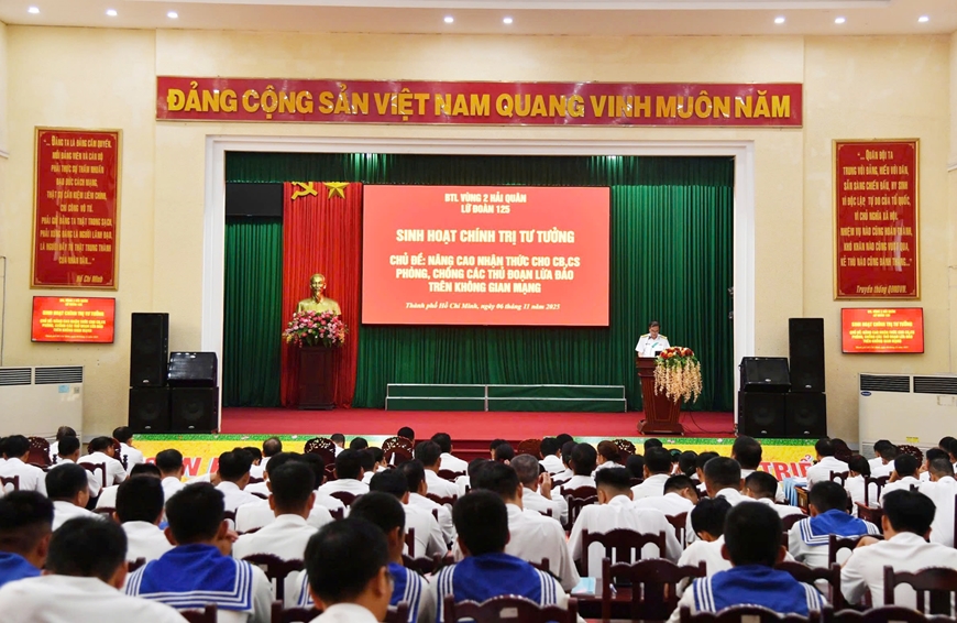 Trong buổi sinh hoạt, cán bộ, chiến sĩ Lữ đoàn 125 xem video về các thủ đoạn lừa đảo trên mạng xã hội hiện nay; nghe quán triệt các văn bản về tình hình chấp hành pháp luật, kỷ luật trong thời gian qua; nghe tuyên truyền các văn bản về bảo đảm an toàn, an ninh mạng.