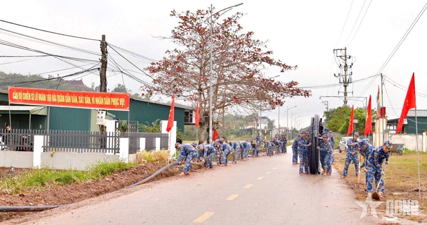 Cán bộ, chiến sĩ Lữ đoàn 169 Hải quân tham gia lắp đặt đường ống nước tại địa phương, bảo đảm nhu cầu sử dụng nước sạch sinh hoạt của nhân dân.