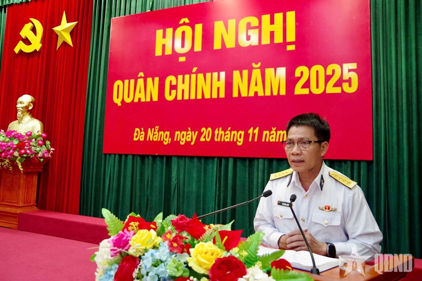 Đại tá Phạm Quang Vinh, Phó tư lệnh Vùng 3 Hải quân phát biểu chỉ đạo Hội nghị quân chính năm 2025 tại Trung tâm Bảo đảm kỹ thuật.