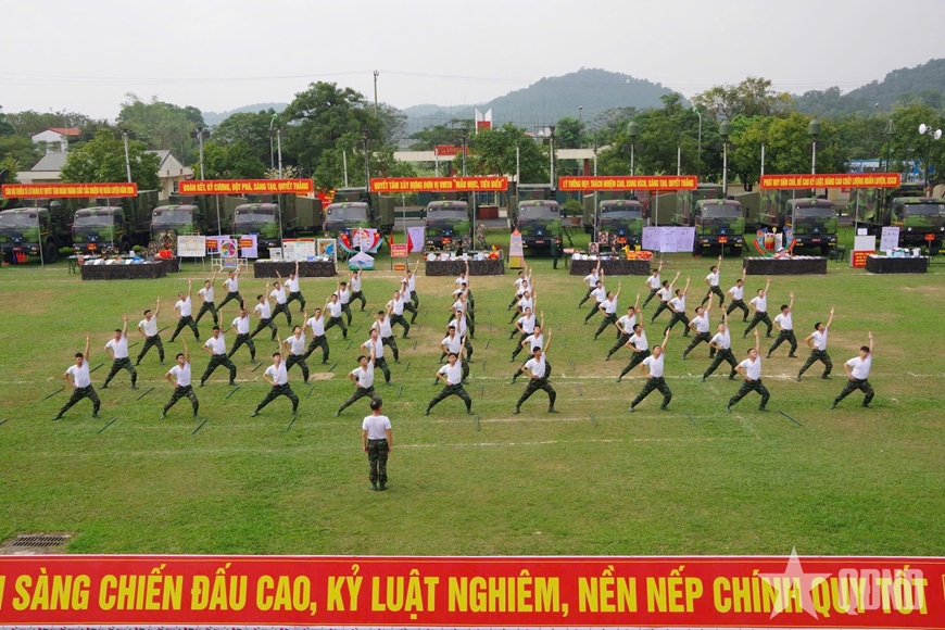 Cũng tại buổi lễ, các khối tổ chức đồng diễn thể dục và chạy thể thao quân sự trong khí thế hào hứng, sôi nổi, thể hiện sự thống nhất, kỷ luật và sức mạnh tập thể của cán bộ, chiến sĩ toàn đơn vị. Hoạt động này không chỉ góp phần nâng cao thể lực, sức bền cho bộ đội mà còn xây dựng ý chí, bản lĩnh, tinh thần đoàn kết - yếu tố quan trọng trong thực hiện nhiệm vụ huấn luyện và sẵn sàng chiến đấu.