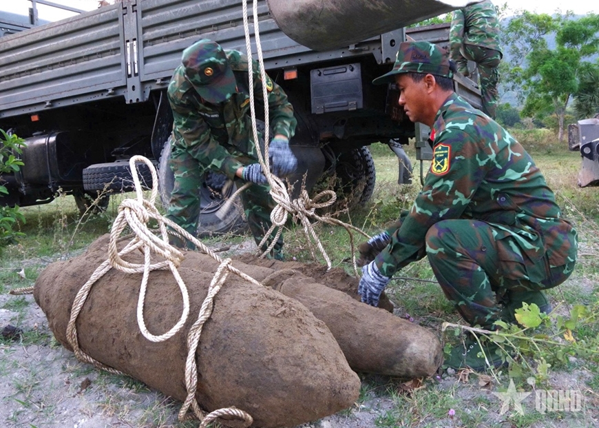| Vận chuyển bom, mìn ra vị trí tập kết để hủy nổ. |
