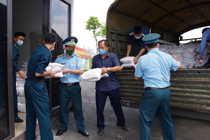 | Cán bộ, chiến sĩ Lữ đoàn Công binh 28 bàn giao gạo hỗ trợ nhân dân địa phương. |