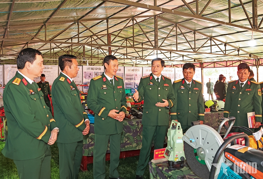 | Trung tướng Đào Tuấn Anh, Tư lệnh Quân đoàn 34 và các đại biểu tham quan trang bị, mô hình huấn luyện của Lữ đoàn Công binh 7 trưng bày tại lễ kỷ niệm. |