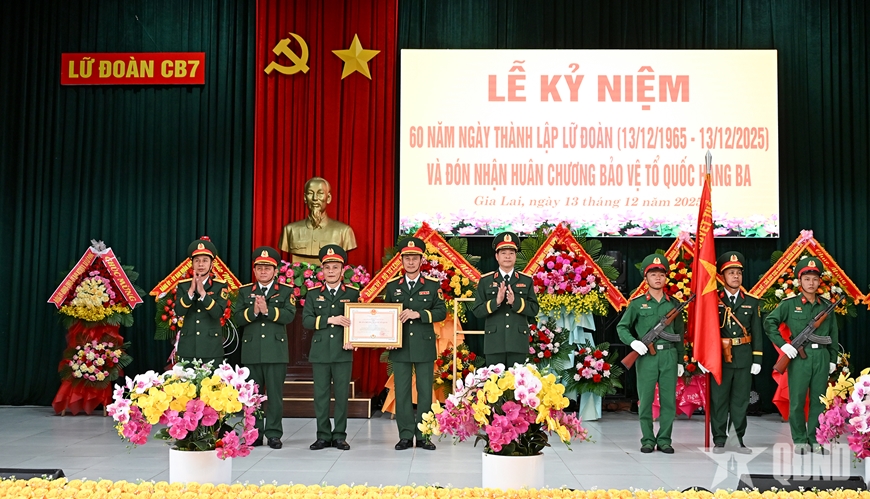 Thừa ủy quyền của Chủ tịch nước, Trung tướng Đào Tuấn Anh, Tư lệnh Quân đoàn 34 trao Huân chương Bảo vệ Tổ quốc hạng Ba cho Lữ đoàn Công binh 7.