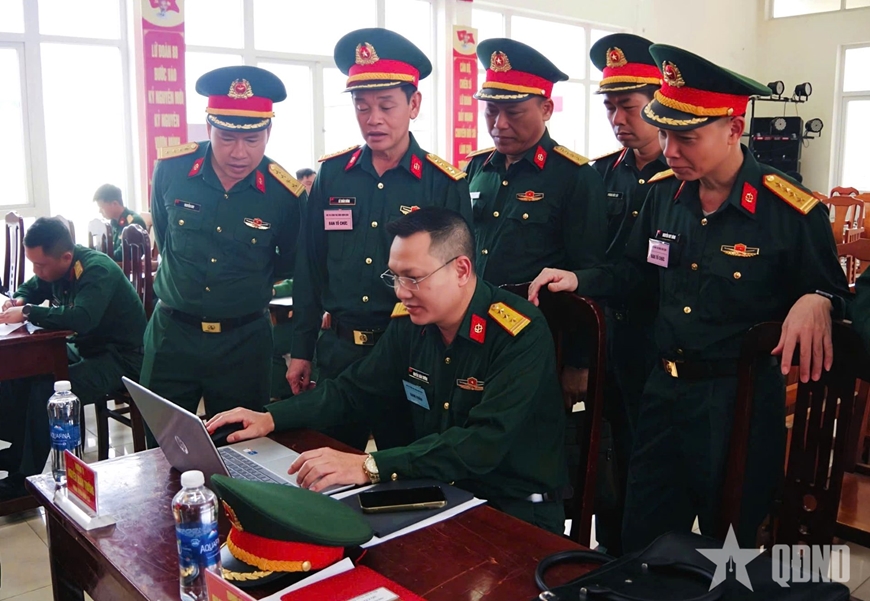 | Đoàn công tác Binh chủng Hóa học kiểm tra kết quả thi nhận thức công tác Đảng, công tác chính trị bằng hình thức quét mã QR. |