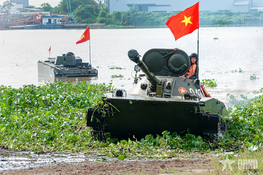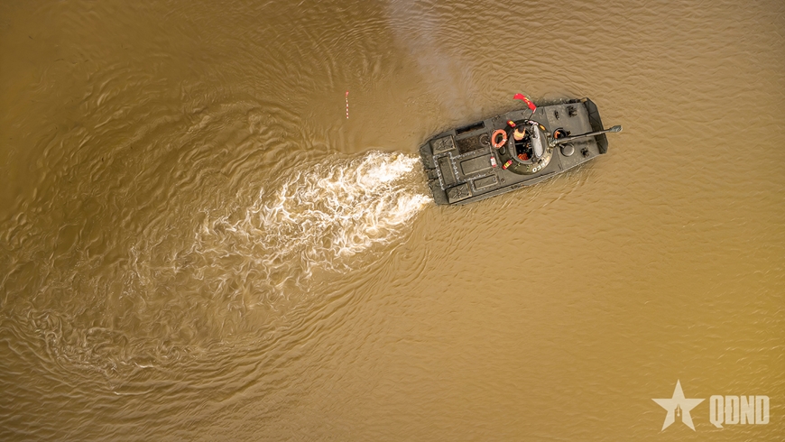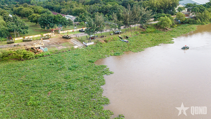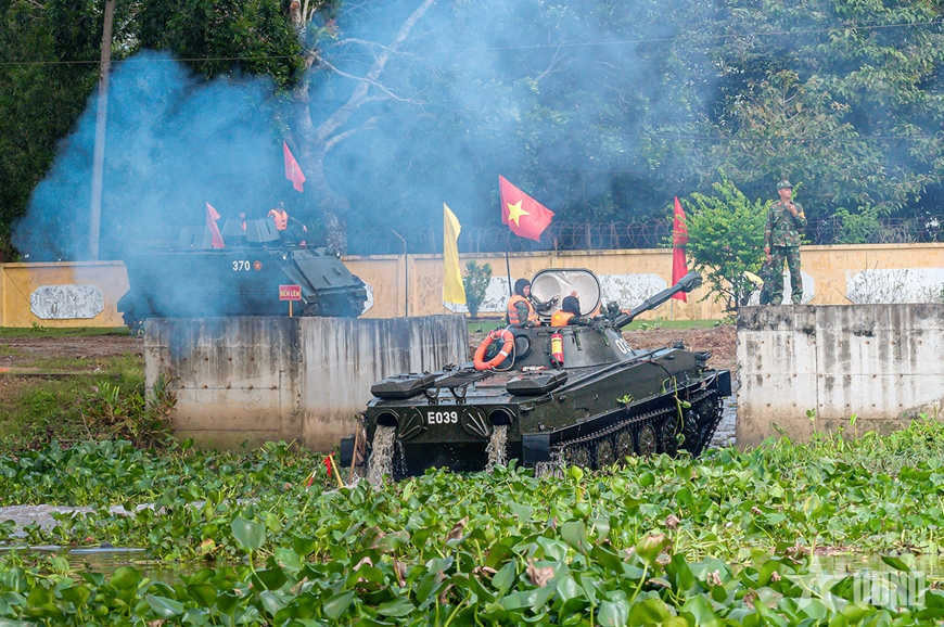 Kíp xe vượt qua các vật cản trong kiểm tra lái bơi xe Tăng thiết giáp cho đội ngũ lái xe tại Cảng Đồng Tâm của Lữ đoàn Tăng thiết giáp 416. |