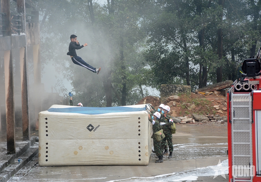 Lực lượng của Binh chủng Công binh thao diễn phương án phòng, chống cháy nổ, cứu hộ, cứu nạn. Ảnh: qdnd.vn