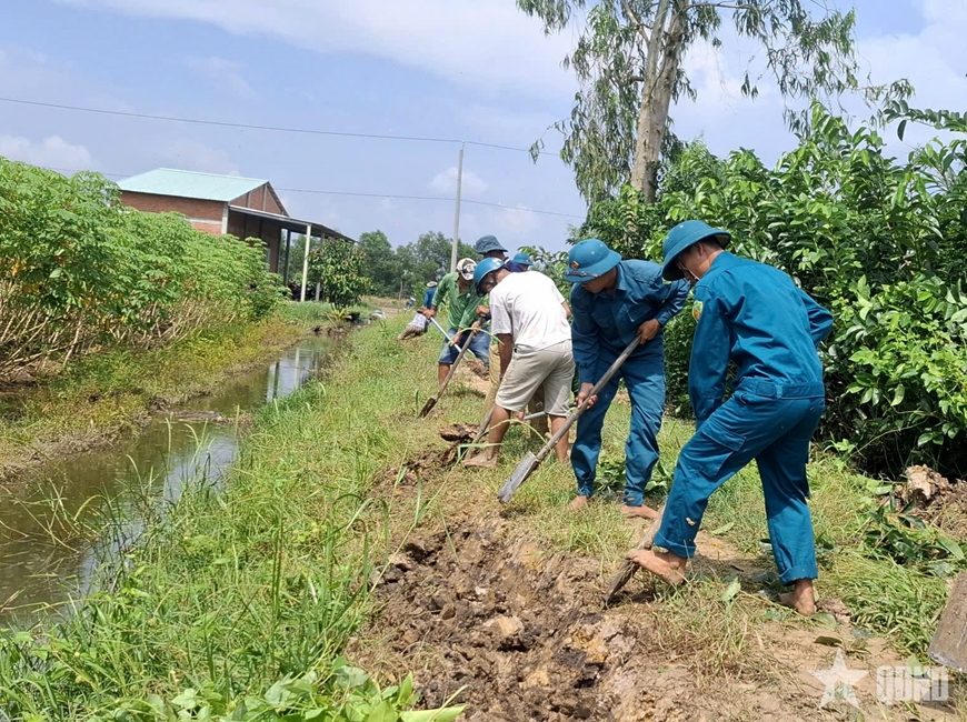 | Dân quân xã Bình Thành cùng người dân nâng cao tuyến đê bao bảo vệ khu sản xuất. |
