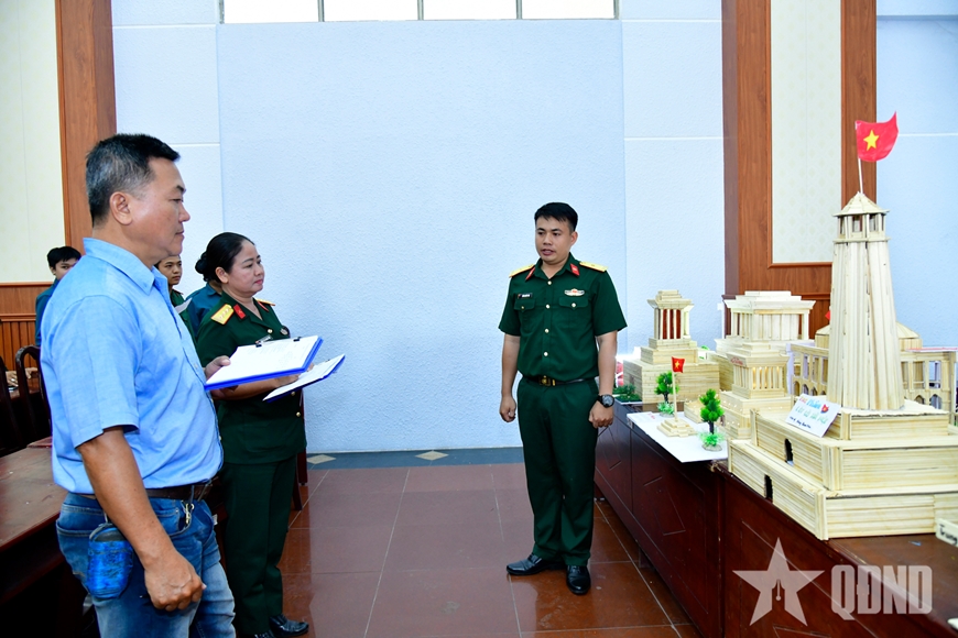 | Ban giám khảo chấm thi các mô hình làm bằng tăm tre. |