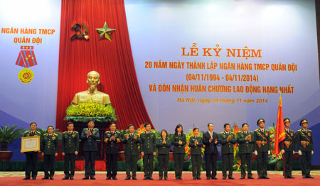 QĐND Online - Sáng 4-11, tại Hà Nội, Ngân hàng TMCP Quân đội (MB) đã tổ chức Lễ kỷ niệm 20 năm ngày thành lập (4-11-1994 / 4-11-2014) và đón nhận Huân chương Lao động Hạng Nhất. Đến dự lễ kỷ niệm có Đại tướng Phùng Quang Thanh, Ủy viên Bộ Chính trị, Phó bí thư Quân ủy Trung ương, Bộ trưởng Bộ Quốc phòng; đồng chí Nguyễn Văn Bình, Ủy viên Trung ương Đảng, Thống đốc Ngân hàng Nhà nước Việt Nam...