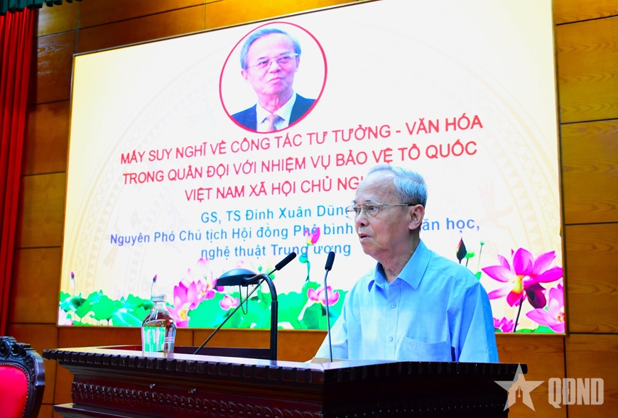 | GS, TS Đinh Xuân Dũng, nguyên Phó chủ tịch Hội đồng Lý luận, Phê bình Văn học, Nghệ thuật Trung ương phát biểu tại hội thảo. |