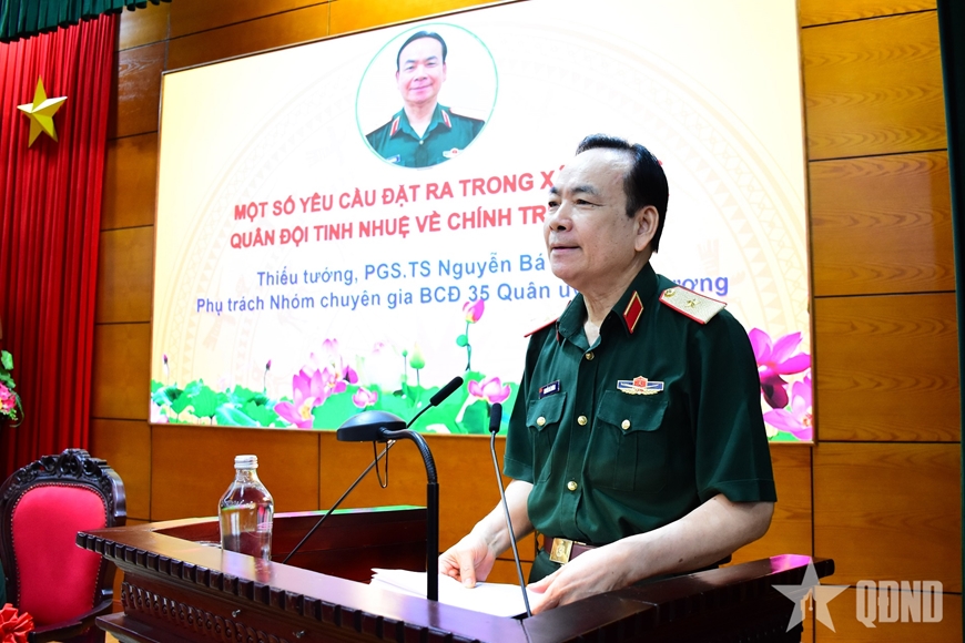 | Thiếu tướng, PGS, TS Nguyễn Bá Dương, Phụ trách Nhóm chuyên gia Ban chỉ đạo 35 Quân ủy Trung ương phát biểu tại hội thảo. |