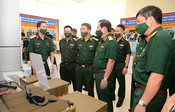 | Thượng tướng Lê Huy Vịnh và các đại biểu tham quan sản phẩm đề tài của Chương trình KHCN. |