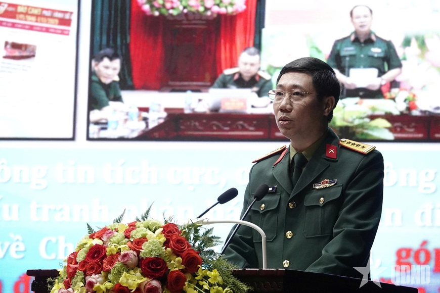 | Thiếu tướng Nguyễn Thế Mạnh, Phó chính ủy Trường Sĩ quan Chính trị phát biểu tại hội nghị. |