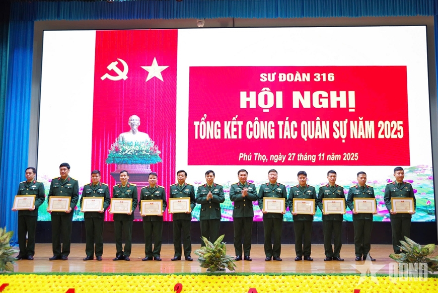 Tại hội nghị, chỉ huy Sư đoàn 316 trao khen thưởng đại diện các tập thể và cá nhân có thành tích xuất sắc tiêu biểu trong thực hiện nhiệm vụ năm 2025.