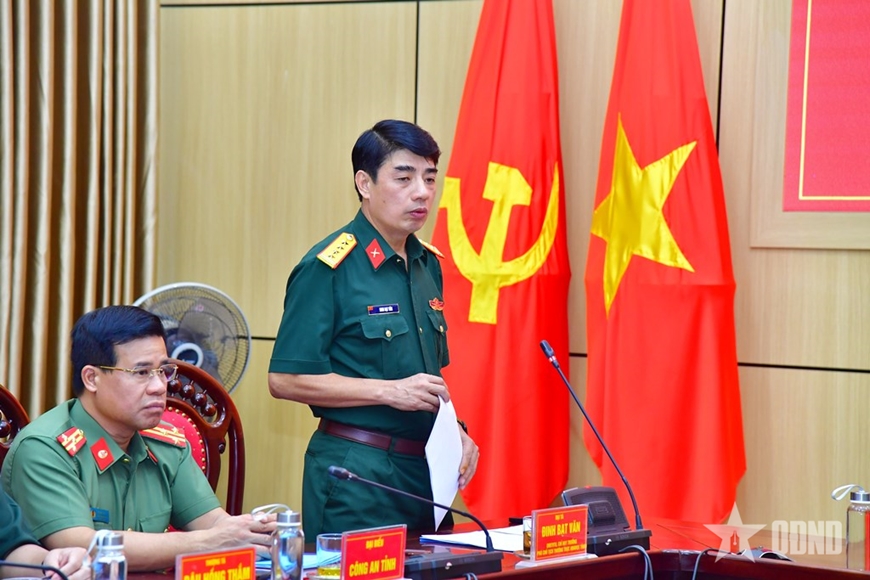 Đại tá Đinh Bạt Văn, Chỉ huy trưởng Bộ CHQS tỉnh, Phó chủ tịch Thường trực Hội đồng Nghĩa vụ quân sự tỉnh phát biểu tại hội nghị. |