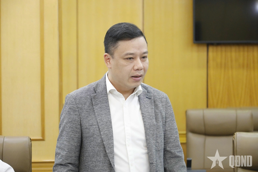 | Đại tá Trần Anh Tuấn, Phó tổng biên tập Báo Quân đội nhân dân phát biểu tại hội nghị. |
