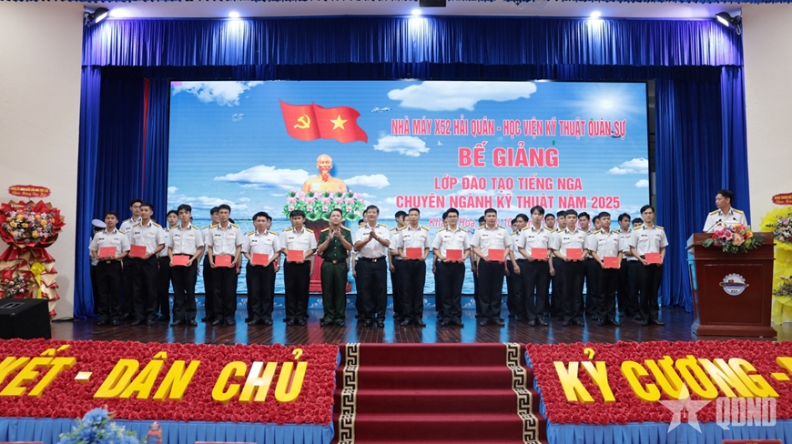 Chương trình thuộc Đề án: “Đào tạo, bồi dưỡng Tiếng Nga chuyên ngành kỹ thuật giai đoạn 2022-2030” của Bộ Quốc phòng tại Nhà máy X52. Ban tổ chức trao giấy chứng nhận cho học viên hoàn thành nội dung bồi dưỡng tiếng Nga.