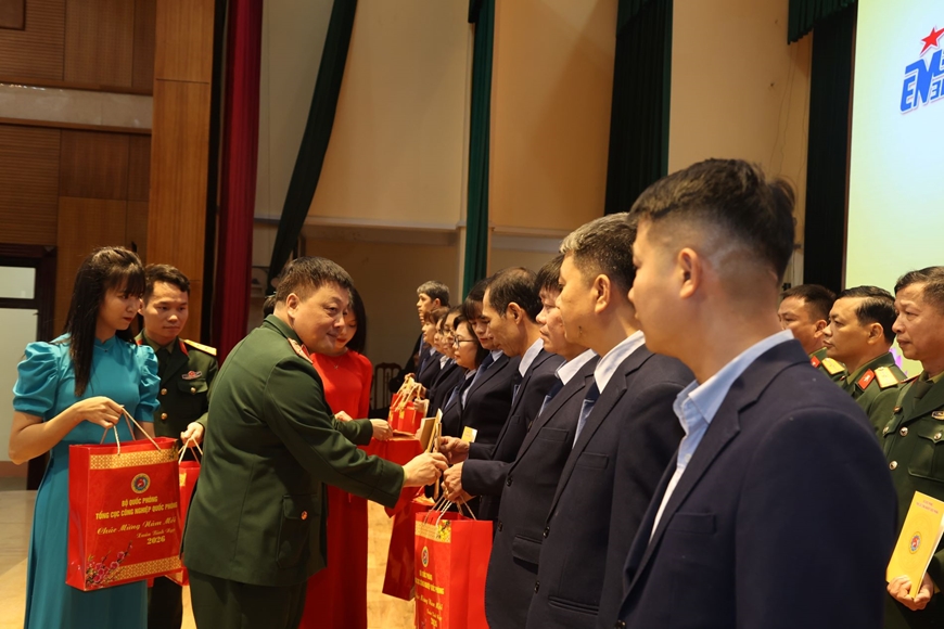 | Thủ trưởng Tổng cục Công nghiệp Quốc phòng trao quà tặng người lao động. |