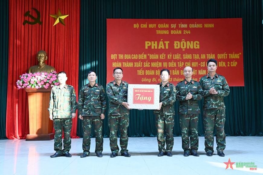 Nhân dịp này, Trung đoàn 244 (Bộ CHQS tỉnh Quảng Ninh) tặng quà, động viên cán bộ, chiến sĩ tham gia diễn tập.