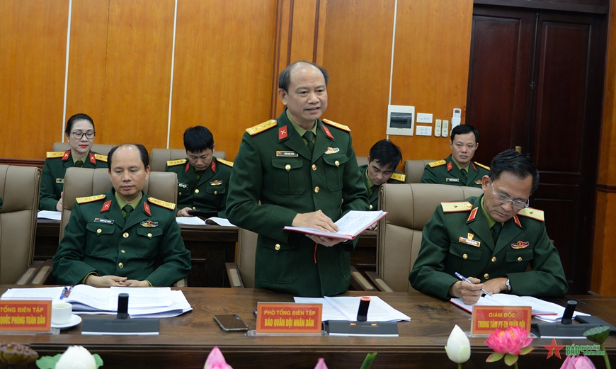 | Đại tá Trần Anh Tuấn, Phó tổng biên tập Báo Quân đội nhân dân phát biểu tại hội nghị. |
