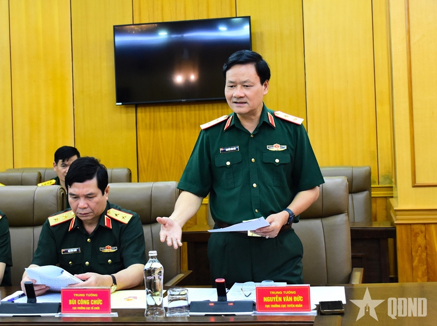 | Trung tướng Nguyễn Văn Đức, Cục trưởng Cục Tuyên huấn (Tổng cục Chính trị) báo cáo kết quả thẩm định hồ sơ, thành tích của các tập thể, cá nhân. |