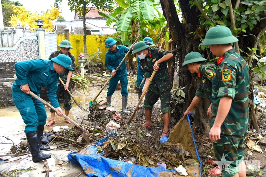 Cán bộ, chiến sĩ các đơn vị tích cực giúp bà con nhân dân khắc phục hậu quả mưa lũ.