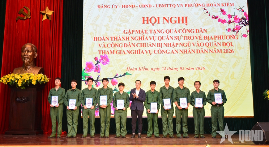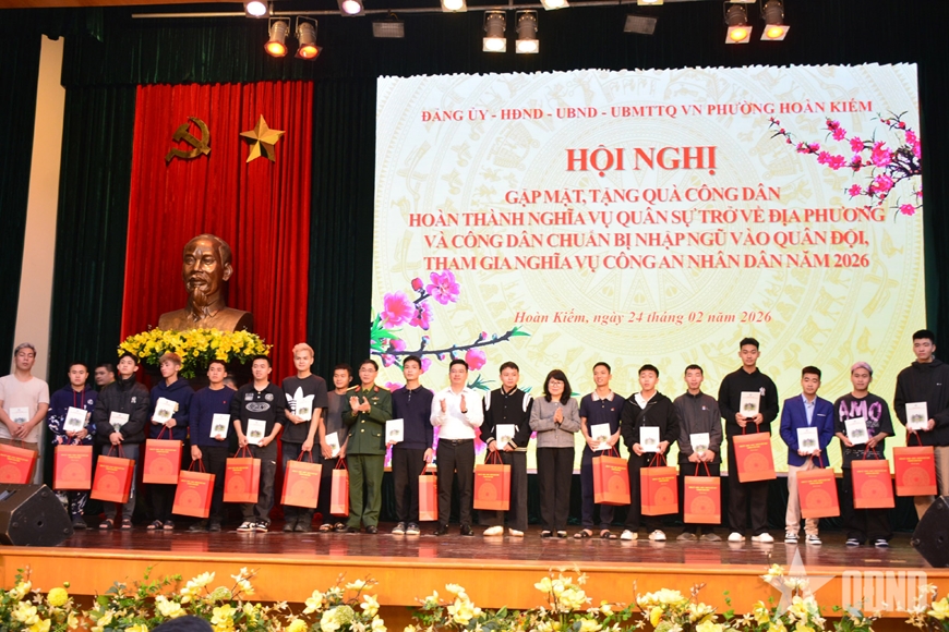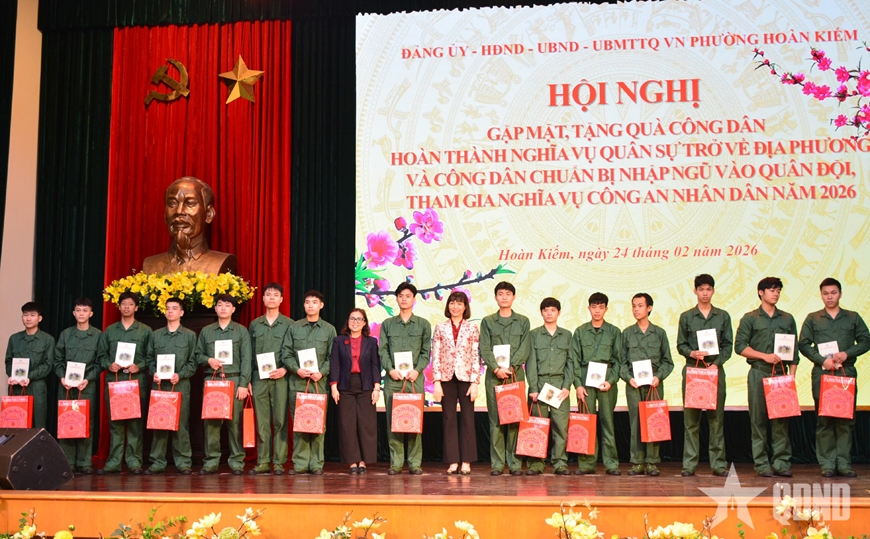 Chiều 24-2, UBND Phường Hoàn Kiếm (thành phố Hà Nội) tổ chức gặp mặt, tặng quà, động viên công dân hoàn thành nghĩa vụ quân sự trở về địa phương và công dân chuẩn bị nhập ngũ vào Quân đội và tham gia nghĩa vụ Công an nhân dân năm 2026.