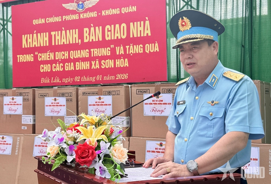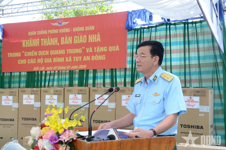 Thủ trưởng Quân chủng PK-KQ cùng đại diện lãnh đạo, cơ quan quân sự, đoàn thể địa phương đã tiến hành cắt băng khánh thành và bàn giao 21 căn nhà cho các hộ dân. Cùng với đó, đoàn đã thăm hỏi, động viên các hộ gia đình được hỗ trợ, chia sẻ những khó khăn, mất mát do thiên tai gây ra; bày tỏ mong muốn các gia đình sớm ổn định chỗ ở, yên tâm lao động, sản xuất và vươn lên trong cuộc sống.