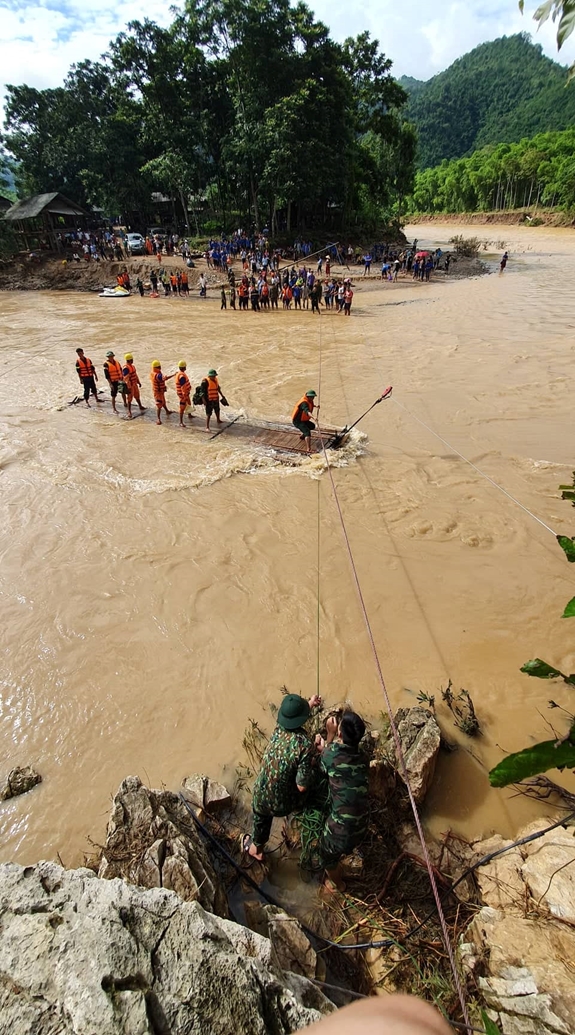 Sử dụng bè mảng đưa các lực lượng tiếp cận bản Sa Ná, xã Na Mèo, huyện Quan Sơn, tỉnh Thanh Hóa.