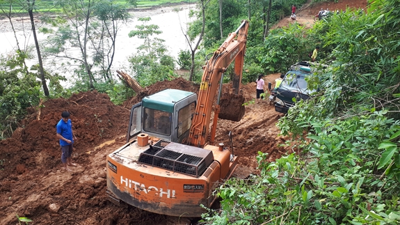 Xe xúc tiến hành thông đường bị sạt lở. |