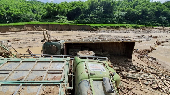 Những chiếc ô tô tải bị lũ cuốn trôi xuống suối Son. |