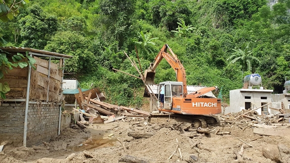 Xe cơ giới san gạt đất, đá bị lũ cuốn xuống bản Na Sá. |