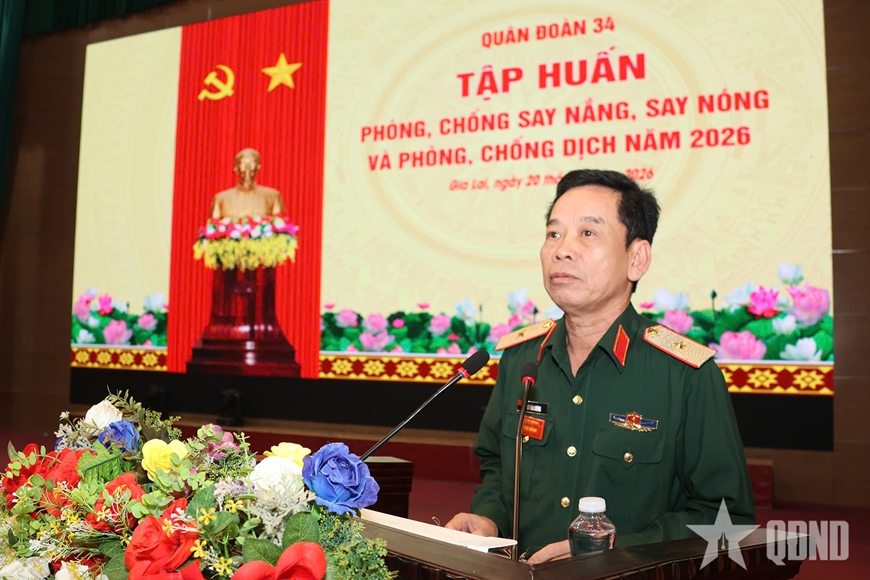 Sáng 20-3, Quân đoàn 34 tổ chức tập huấn phòng, chống say nắng, say nóng, phòng, chống dịch năm 2026. Thiếu tướng Lê Văn Cương, Phó tư lệnh Quân đoàn 34 dự, phát biểu chỉ đạo.