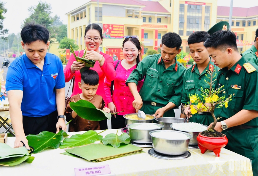 “Ngày hội bánh chưng xanh”, hội thi gói bánh chưng được các đơn vị tổ chức sôi nổi, hấp dẫn với sự tham gia của các cơ quan, đơn vị, địa phương kết nghĩa trên địa bàn. Qua đó không chỉ giáo dục, lưu giữ những phong tục tốt đẹp trong Tết cổ truyền của dân tộc mà còn thắt chặt tình cảm quân dân trên địa bàn. Đặc biệt, sau hội thi các đơn vị đều trao tặng một phần bánh chưng cho các gia đình chính sách, hộ dân nghèo trên địa bàn.