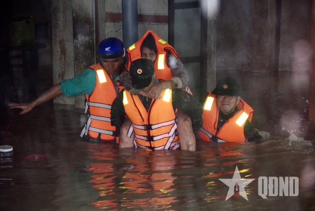 Lực lượng Quân đội cơ động cứu trợ bà con vùng lũ xã Hòa Xuân, tỉnh Đắk Lắk.