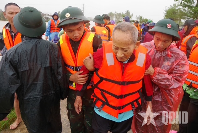Lực lượng Quân đội di dời dân và cứu trợ tại xã Hòa Thịnh.