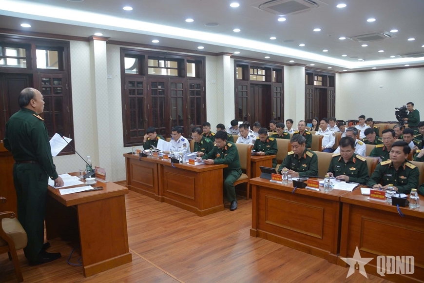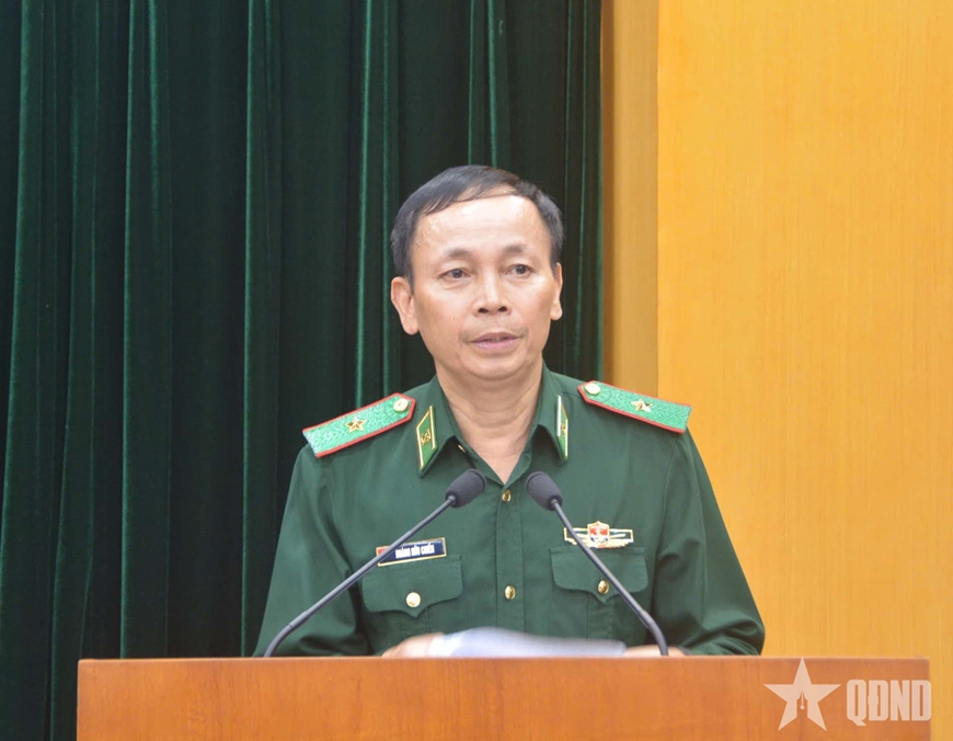 | Thiếu tướng Hoàng Hữu Chiến, Phó tư lệnh, Tham mưu trưởng Bộ đội Biên phòng phát biểu tại phiên họp. |