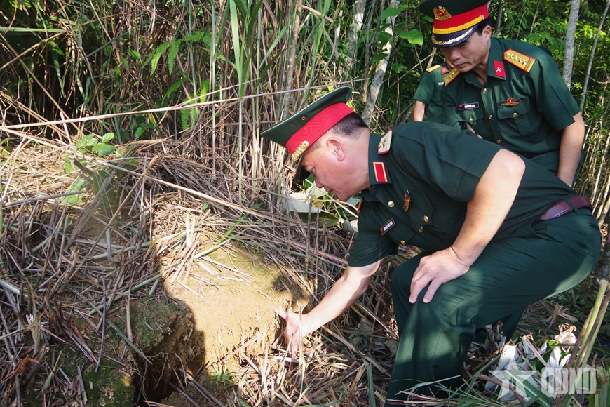 | Thiếu tướng Nguyễn Đăng Khải kiểm tra các vị trí sụt lún, đứt gãy địa chất có nguy cơ xảy ra sạt lở đất tại Ban Chỉ huy PTKV3 - Bảo Yên. |